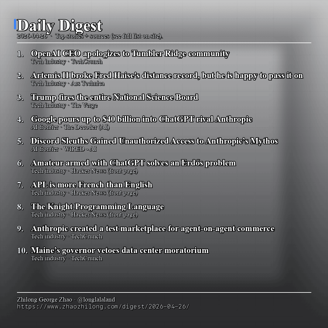 Today: OpenAI CEO apologizes to Tumbler Ridge community · Artemis II broke Fred Haise's distance record, but he is happy… · AI: OpenAI unveils GPT-5.5, claims a "new class of intelligen….