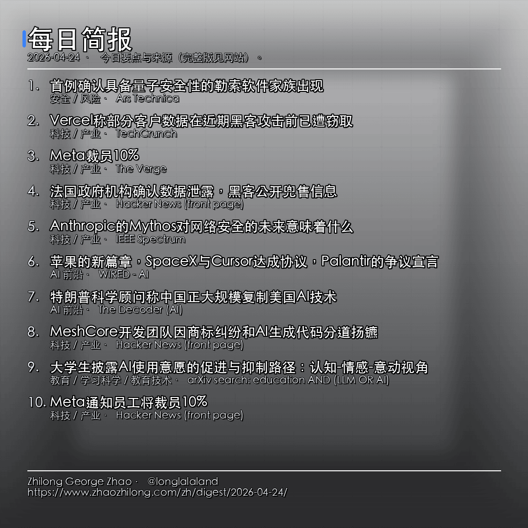 今日关注:首例确认具备量子安全性的勒索软件家族出现;Vercel称部分客户数据在近期黑客攻击前已遭窃取;AI:OpenAI发布GPT-5.5,宣称开启'新型智能等级'并双倍提高…。